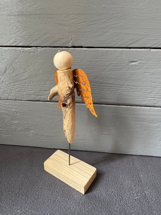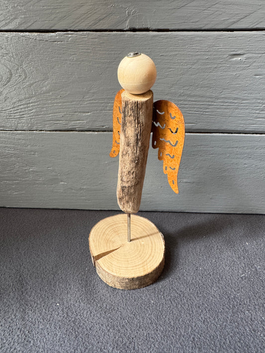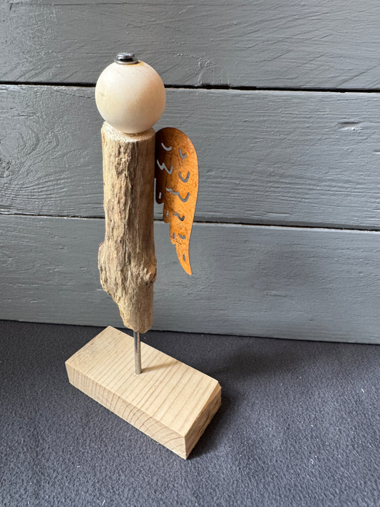 Engel Cassian mit rostfarbenen Flügeln und Treibholz-Fuß – Handgefertigte Deko