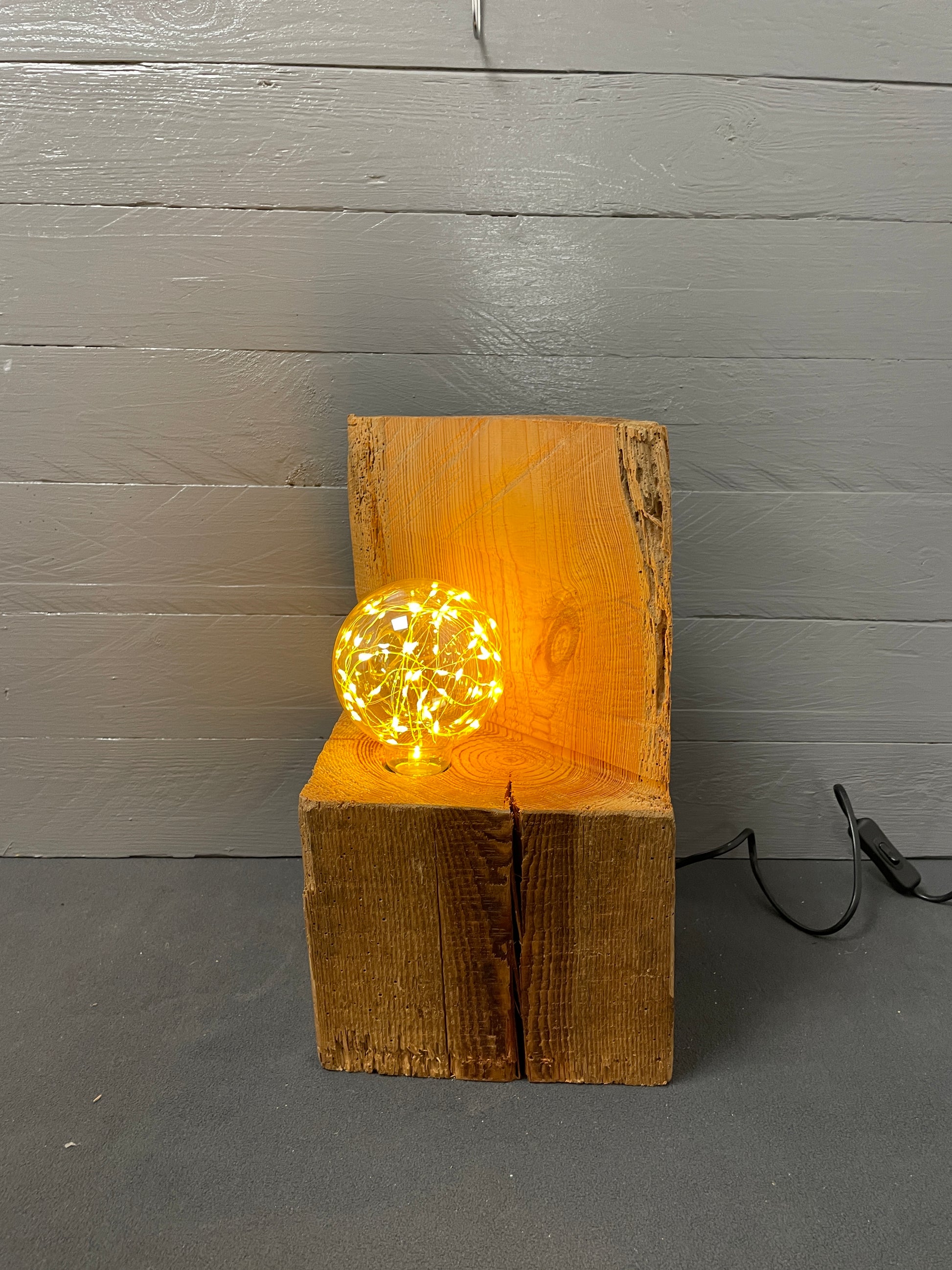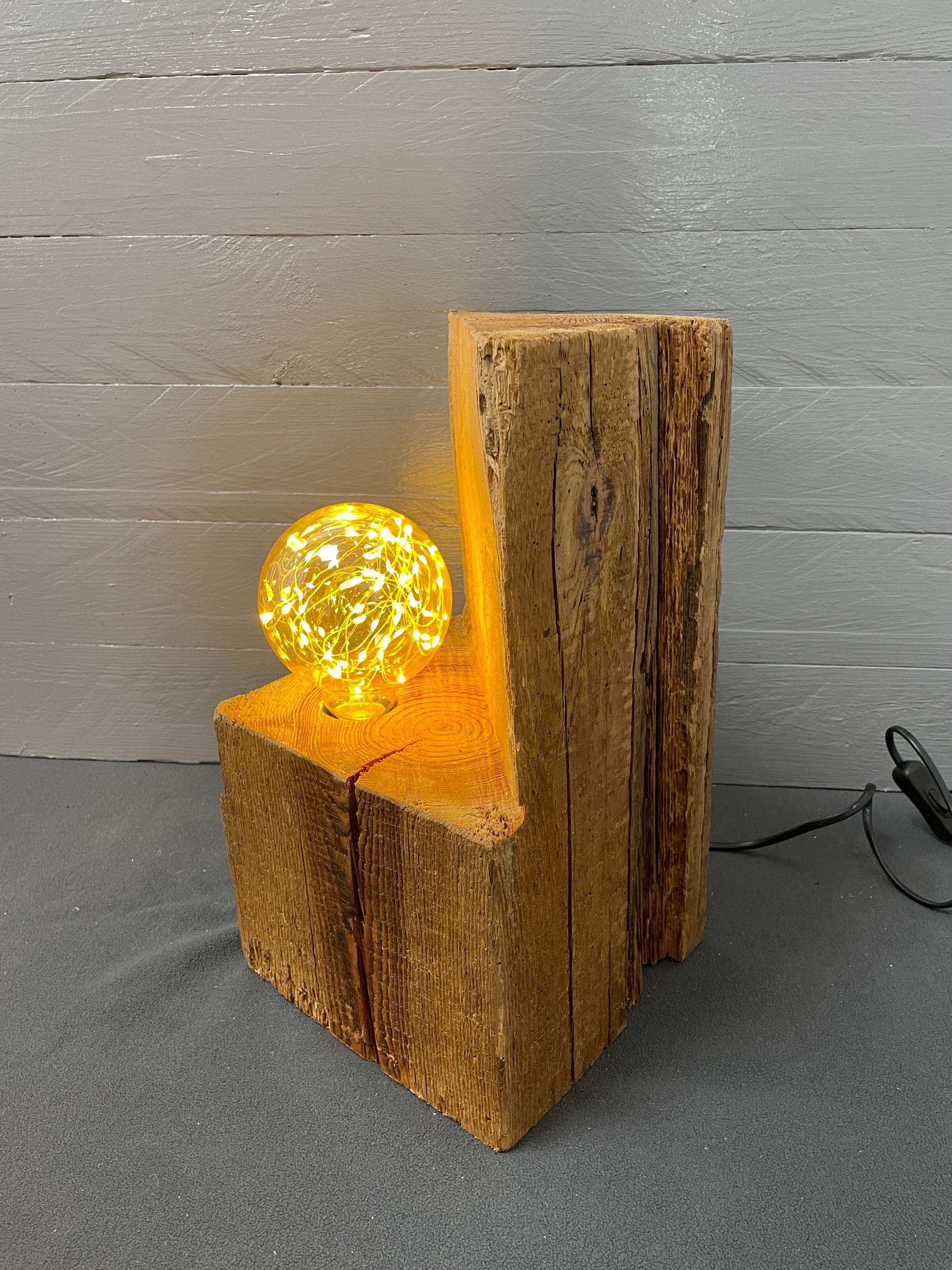 Diese Dachstuhl-Lampe ist ein handgefertigtes Unikat aus einem über 100 Jahre alten Bauernhaus. Das Holz, von einem ehemaligen Dachstuhl stammend und vom Holzwurm gezeichnet, wurde sorgfältig restauriert. Durch die Behandlung mit Bienenwachs bleibt die natürliche Schönheit und Geschichte des Holzes erhalten.