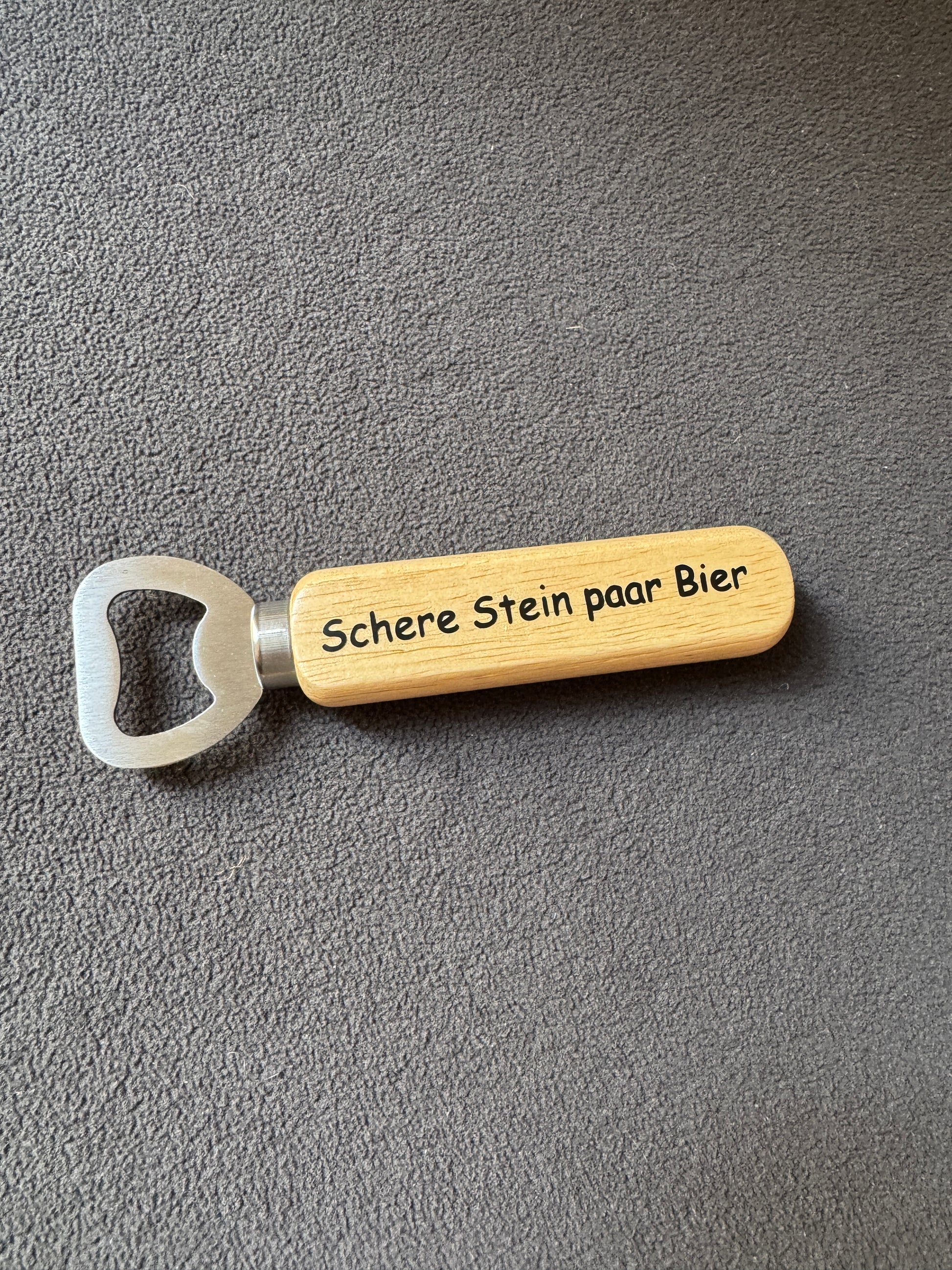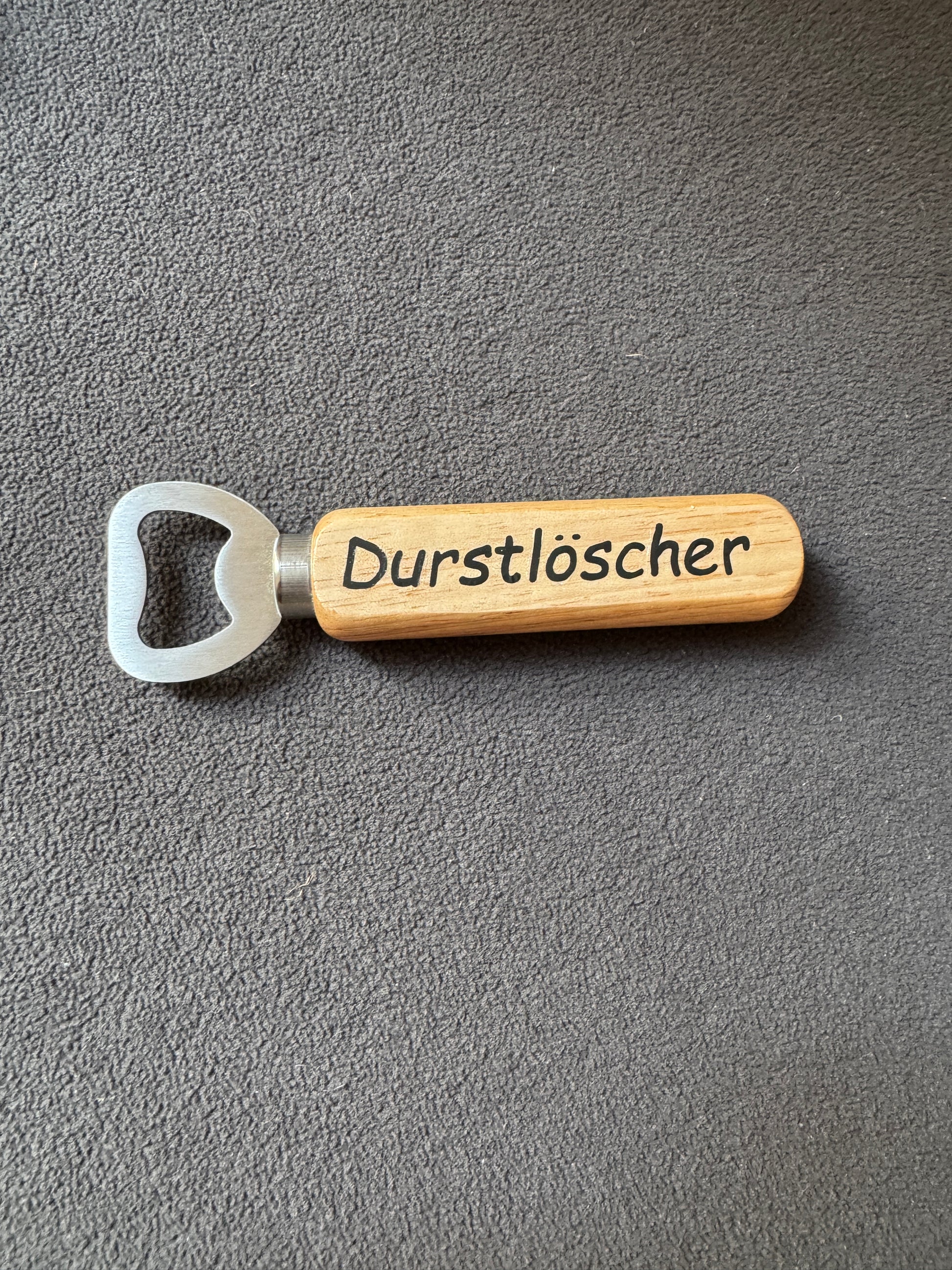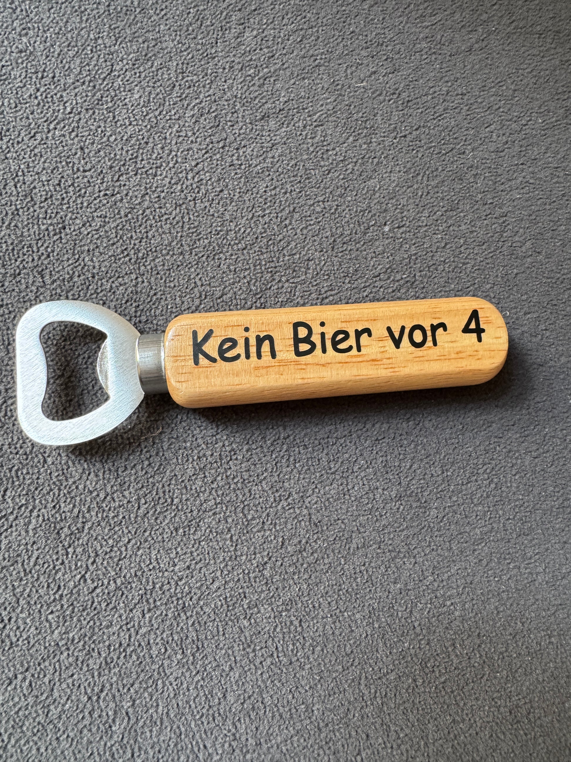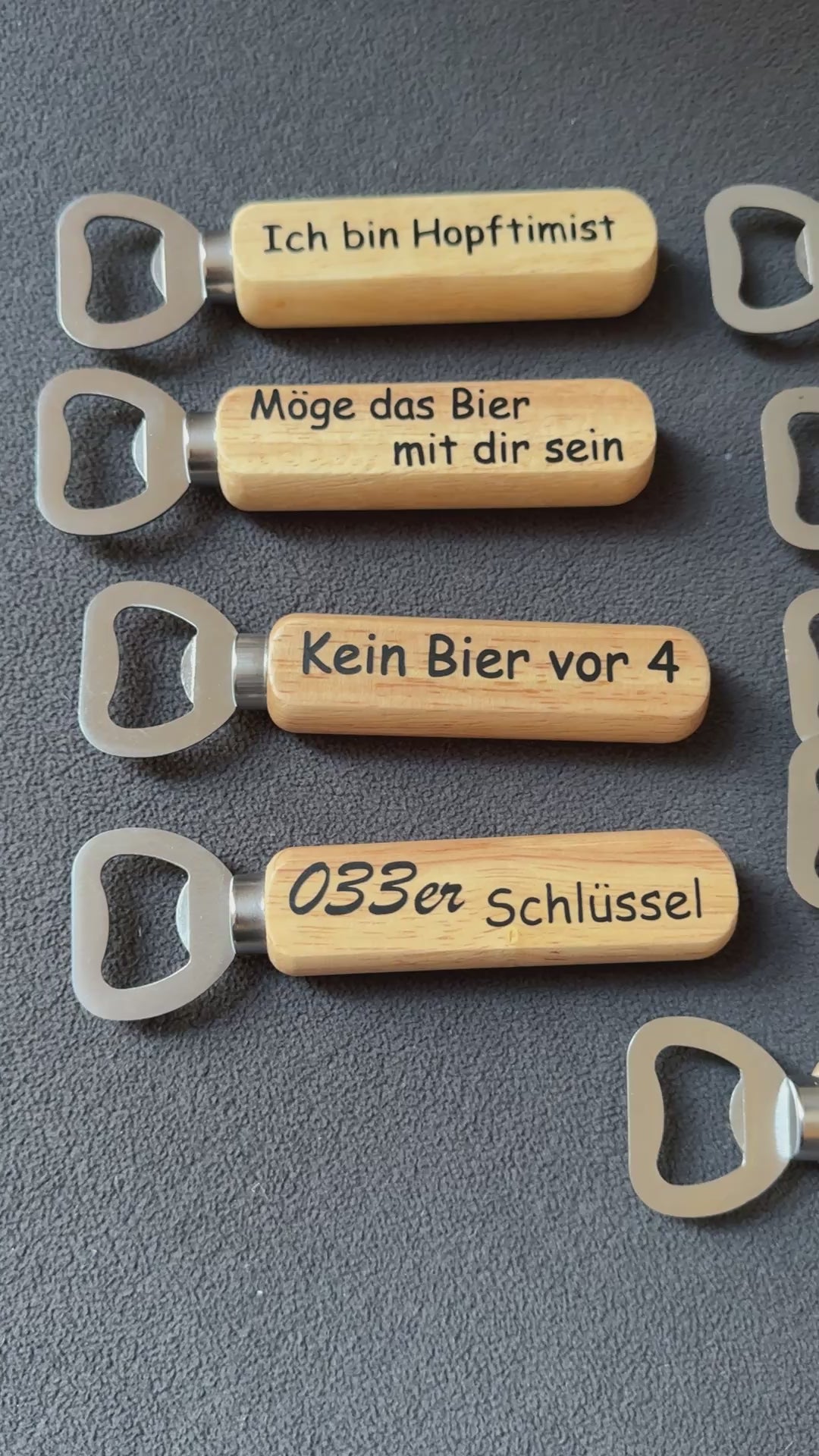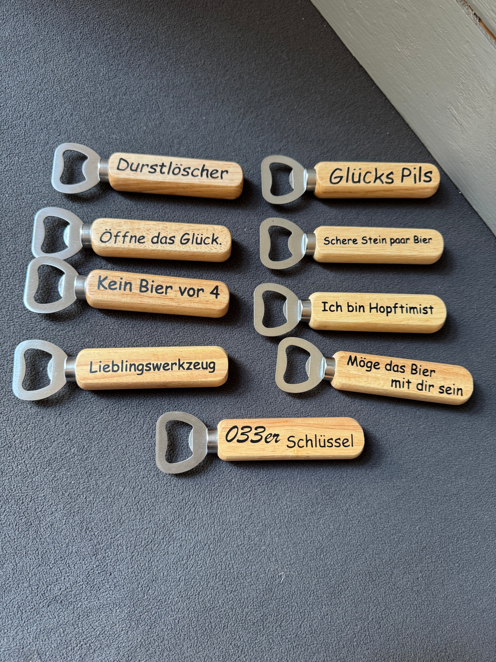 Ob beim Grillabend, beim Camping oder als Geschenk für echte Bierliebhaber – mit diesen handlichen Flaschenöffnern mit witzigem Spruch bist du immer bestens ausgestattet. Der hochwertige Holzgriff liegt angenehm in der Hand und ist mit langlebiger Vinylfolie beklebt – stilvoll, robust und mit einem Augenzwinkern.