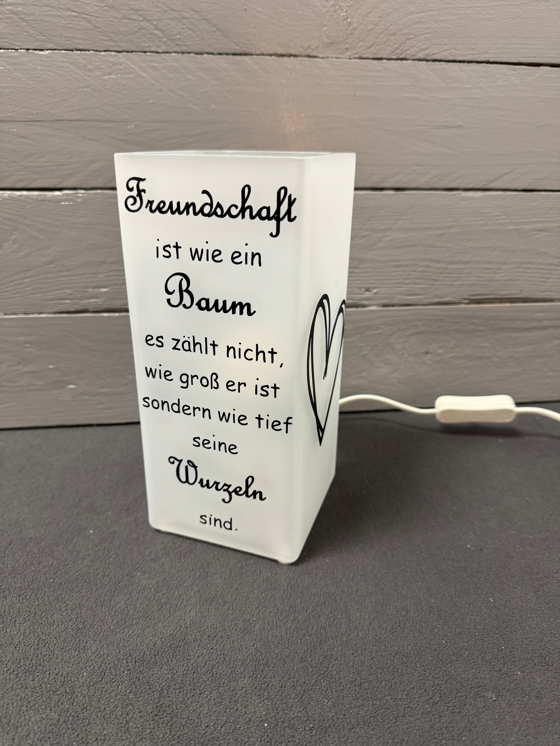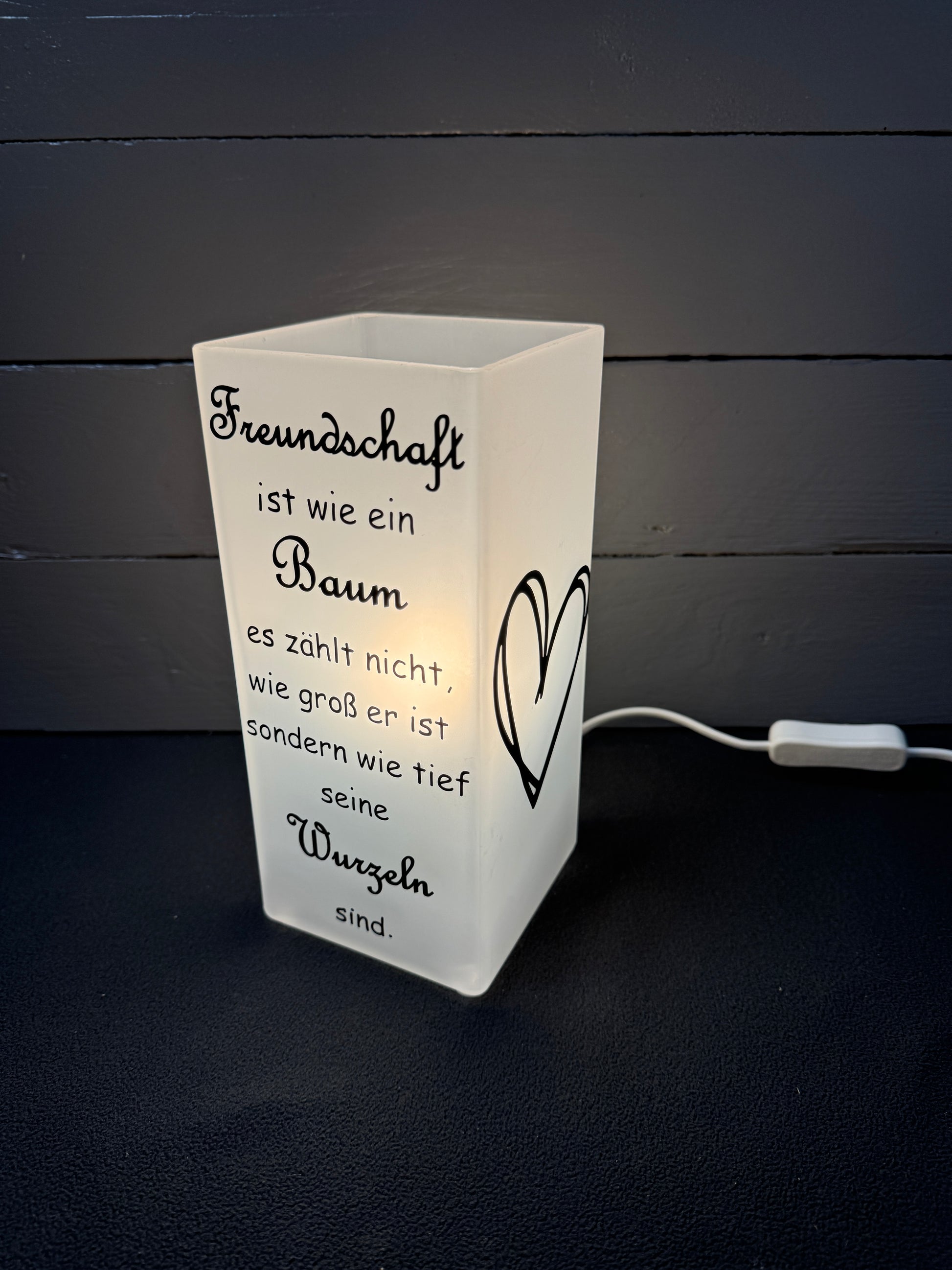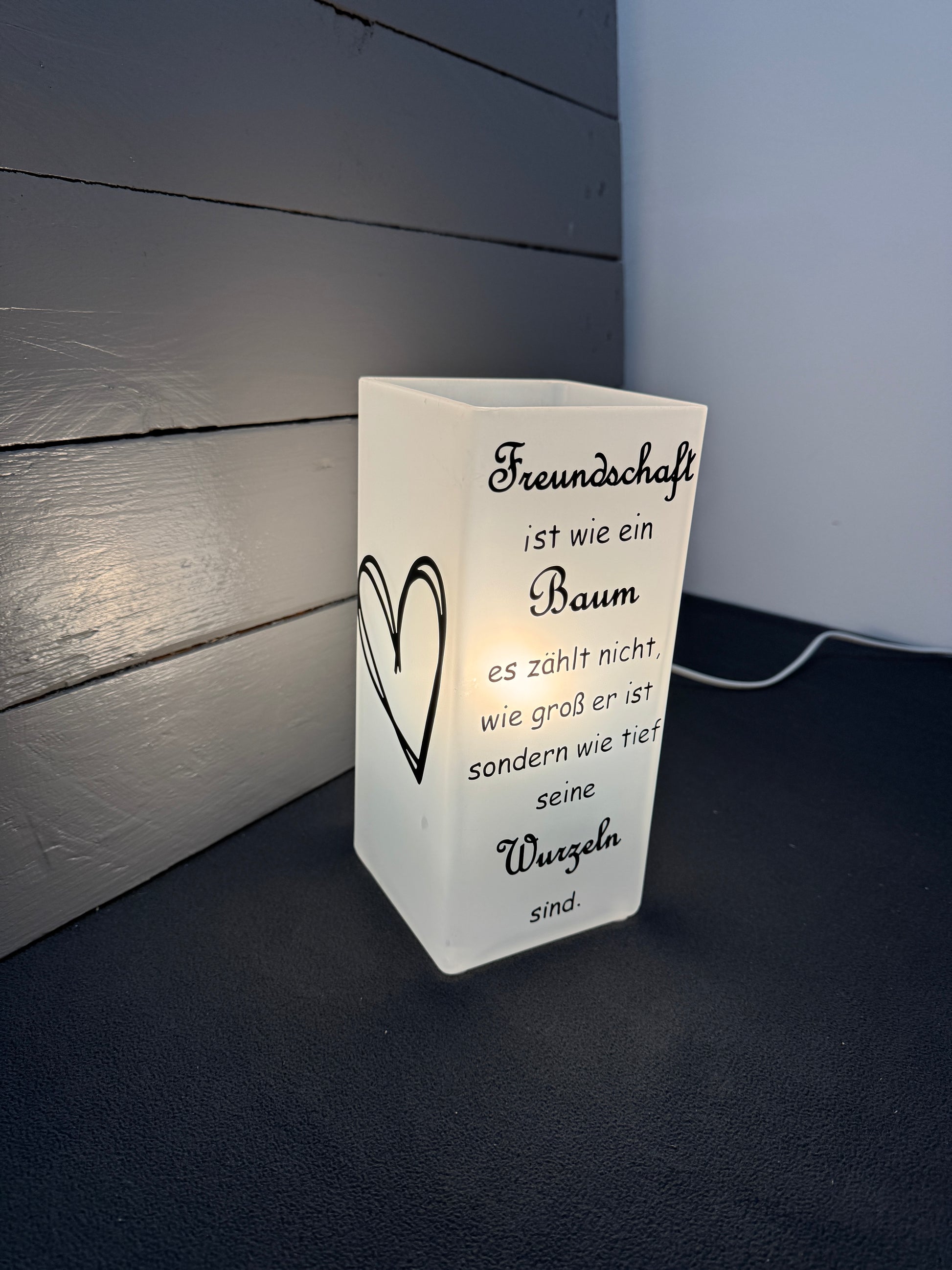 Diese Glaslampe mit Spruch trägt die liebevolle Botschaft über tiefe Freundschaft und erinnert daran, wie bedeutungsvoll echte Verbindungen sein können – unabhängig von Zeit oder Entfernung.